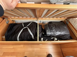 Rozkládací sezení ve tvaru U, dvě oddělené postele , ( možnost dokoupení lamelového roštu pro vytvoření velkého letiště), kuchyň, WC s umyvadlem a SPRCHOU