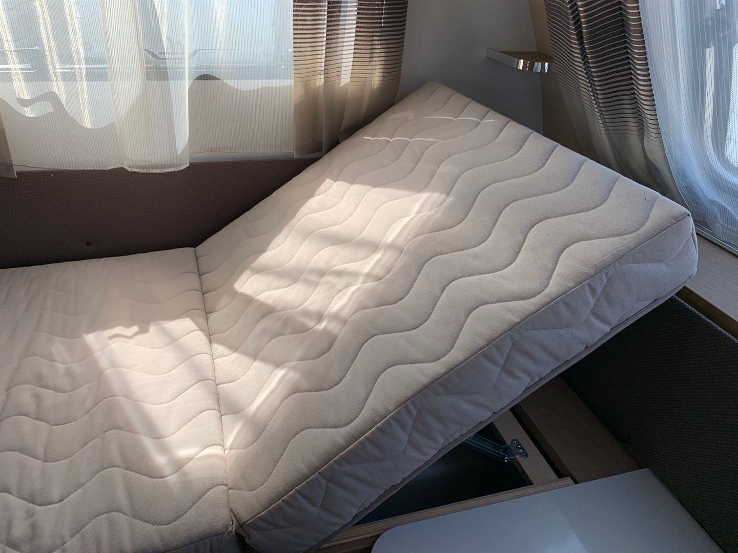 Rozkládací sezení ve tvaru U, dvě oddělené postele + vysouvací rošt pro vytvoření velkého letiště, kuchyň, WC se sprchou