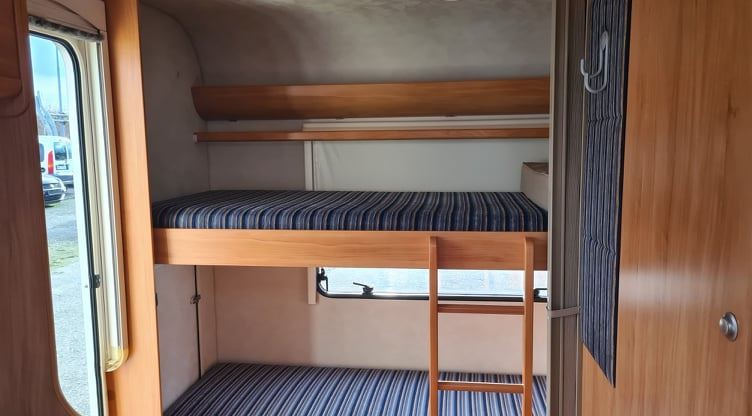 Rozkládací sezení ve tvaru U, boční rozkládací sezení, palandy, kuchyň, WC s umyvadlem