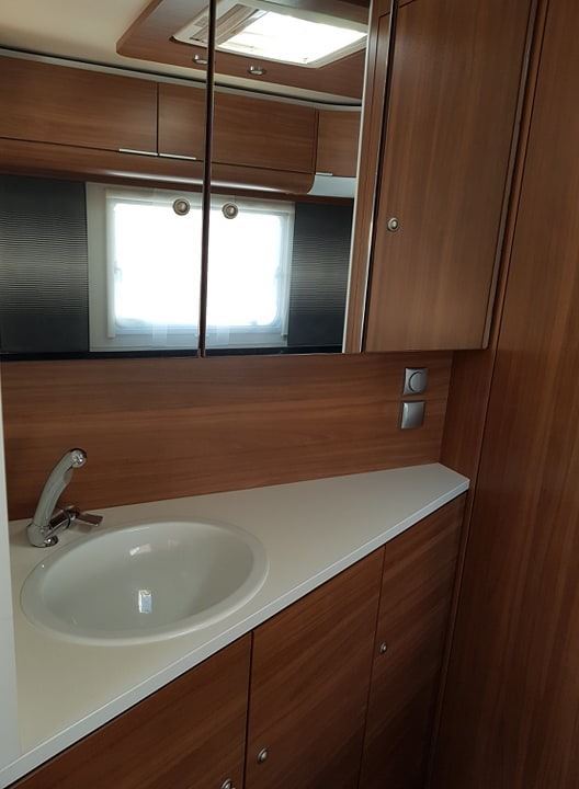 Velké rozkládací sezení ve tvaru U, francouzská postel, kuchyň, WC se sprchou, toaletní koutek