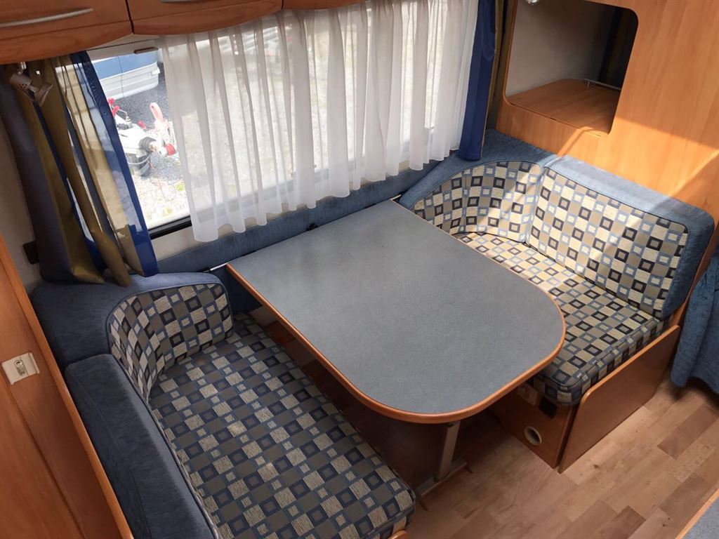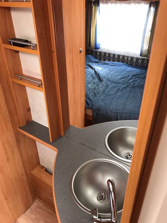 Rozkládací boční sezení, francouzská postel, palanda, kuchyň, WC se sprchou, umyvadlo zvlášť