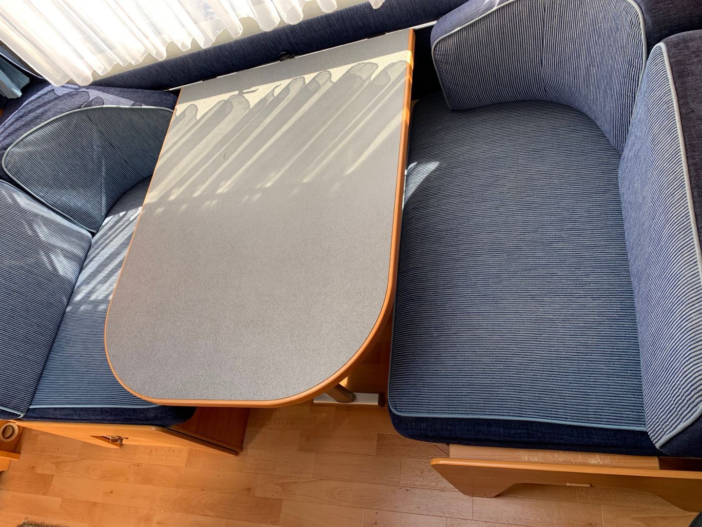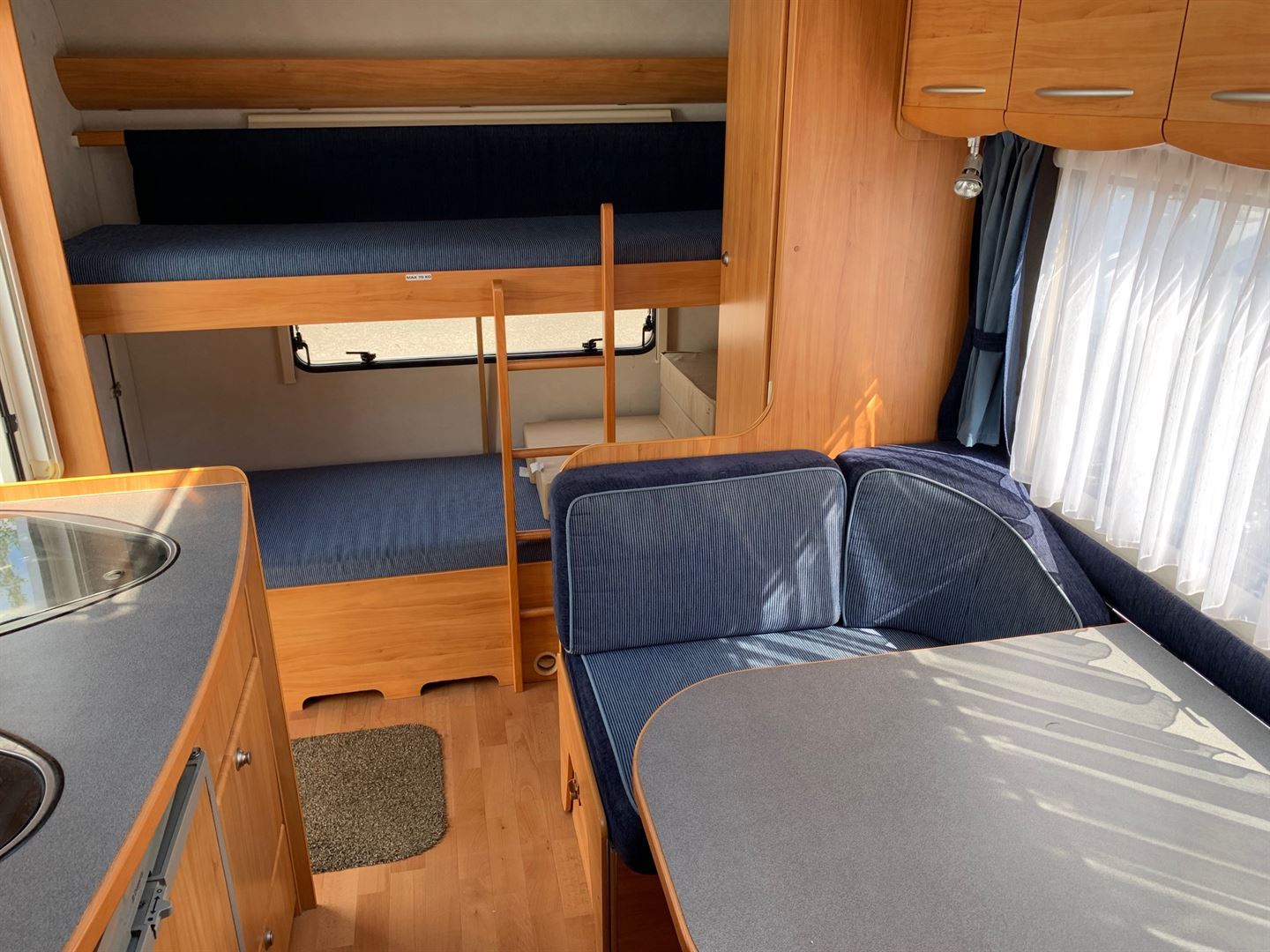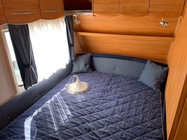 Boční rozkládací sezení, velká francouzská postel, palandy, kuchyň, WC se sprchou, toaletní koutek