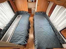 Velké rozkládací sezení do ,,U", dvě oddělené postele (200 x 80 cm), kuchyň, WC, umyvadlo, plnohodnotný samostatný sprchový kout