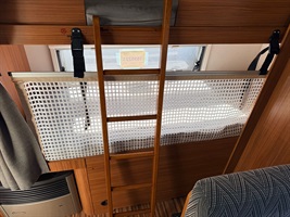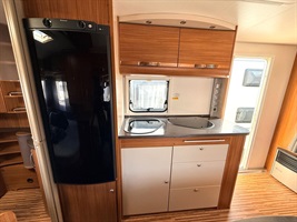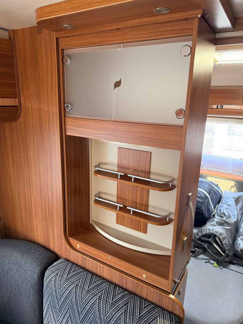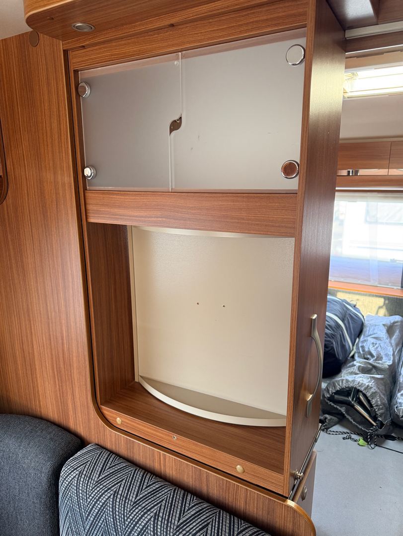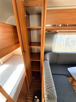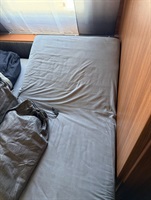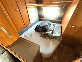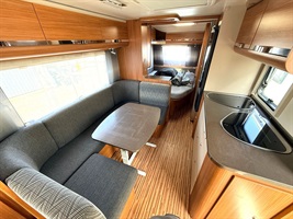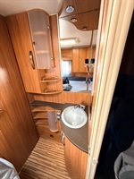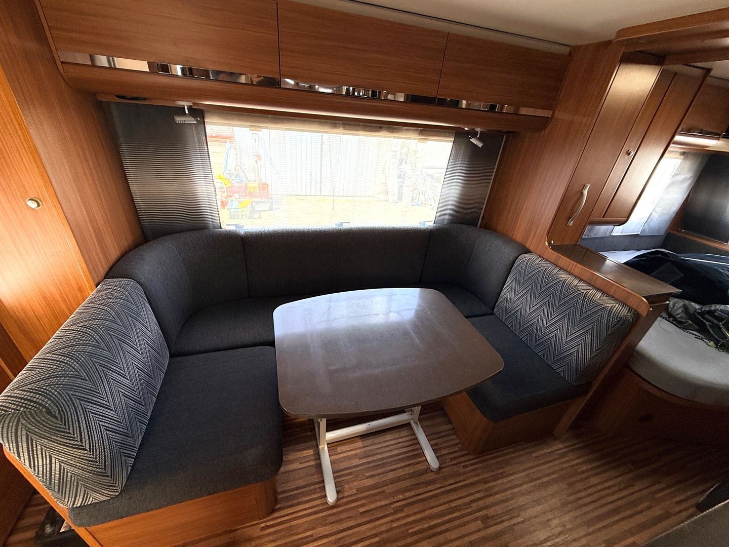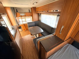 Rozkládací sezení ve tvaru U, velká francouzská postel, zadní palandy, kuchyň, WC se sprchou, umyvadlo zvlášť.