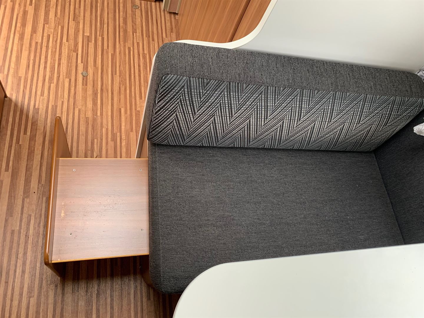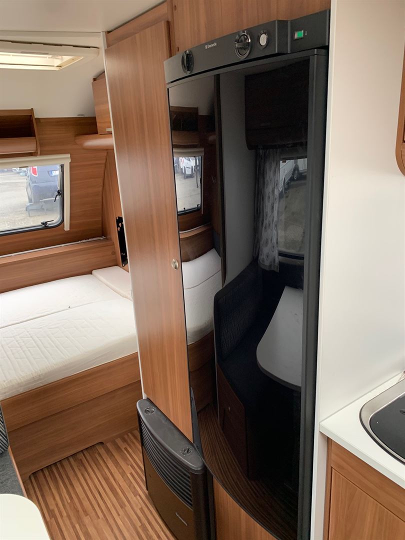 Boční rozkládací sezení s rozšířením, velká francouzská postel, palandy, kuchyň, WC s umyvadlem a sprchou se závěsem.