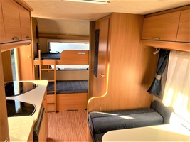 Rozkládací boční sezení, velká francouzská postel, palandy, kuchyň, WC s umyvadlem
