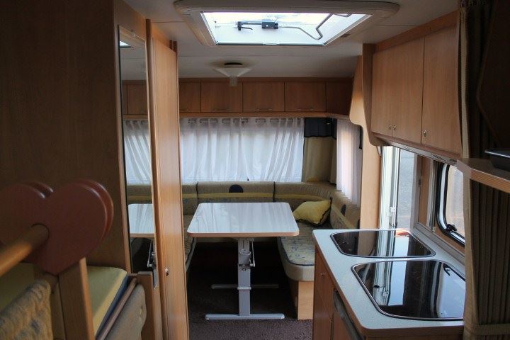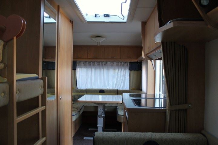sezení do "U" ,patrové postele, boční sezení,kuchyň s lednicí,dřezem a vařičem,bojler TRUMA na teplou vodu,plyn.topení TRUMA s rozfukem,WC,střešní okno 2 x,nájezdová brzda se stabilizátorem,rezerva pod karavanem..