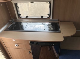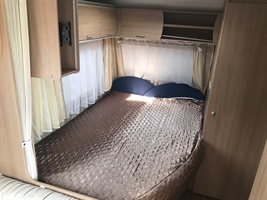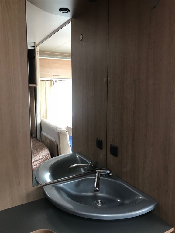 Boční rozkládací sezení, velká francouzská postel, kuchyň, WC se sprchou a sprchovou vaničkou, umyvadlo zvlášť