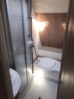 Rozkládací sezení do ,,U" na boku karavanu, velká francouzská postel, kuchyň, WC, oddělitelná sprcha, umyvadlo zvlášť