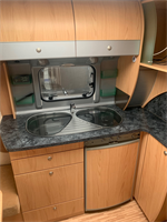 Velké rozkládací sezení ve tvaru U, francouzská postel, kuchyň, WC se sprchou, toaletní koutek