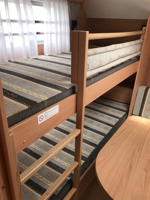 Rozkládací sezení do ,,U", rozkládací boční sezení na lůžko, velká palanda, kuchyň, WC s umyvadlem a sprchovou vaničkou