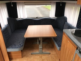 Rozkládací sezení do ,,U", velká francouzská postel, kuchyň, WC se sprchou, umyvadlo zvlášť.