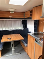 Velké rozkládací sezení do ,,U", velká francouzská postel, kuchyň, WC se sprchou a sprchovou vaničkou, umyvadlo zvlášť