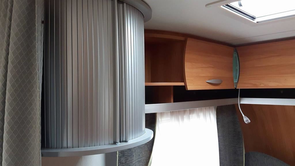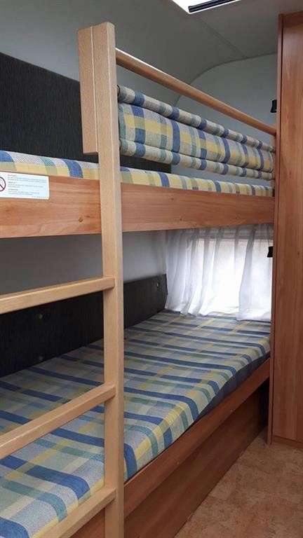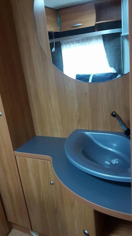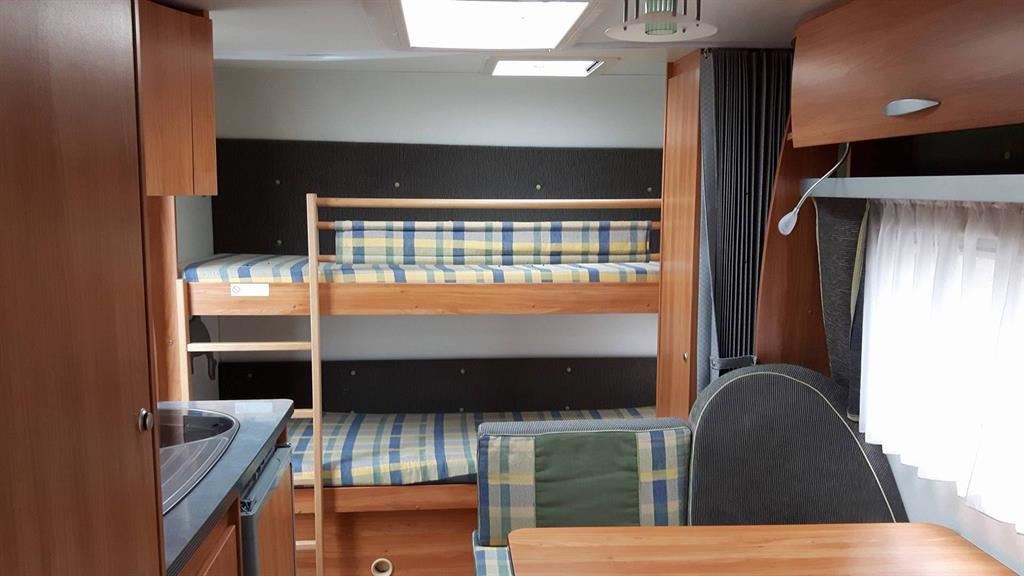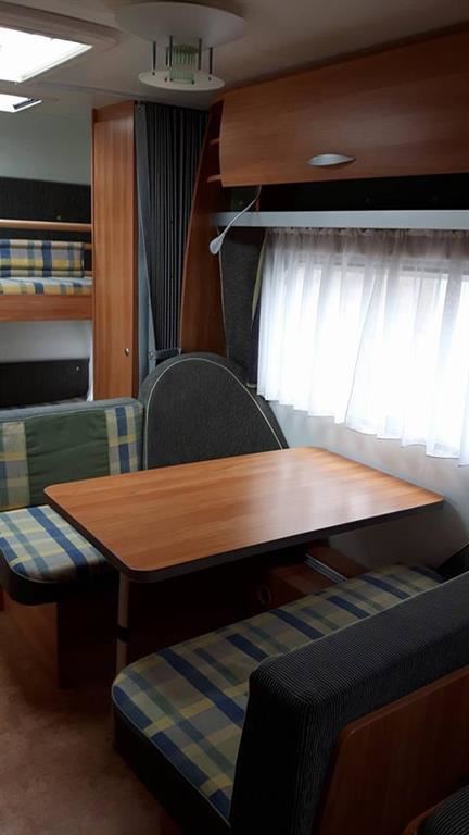 Rozkládací boční sezení, velká francouzská postel, palanda, kuchyň, WC se sprchou, umyvadlo se zrcadlem zvlášť.