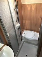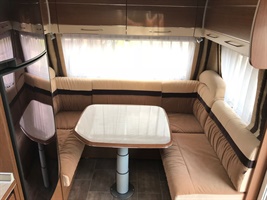 Velké rozkládací sezení ve tvaru U, francouzská postel, kuchyň, WC, plnohodnotná sprcha, umyvadlo zvlášť.