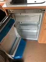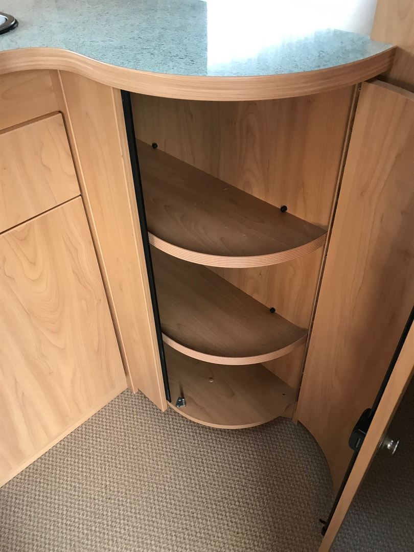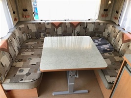 Velké rozkládací sezení ve tvaru U, francouzská postel, kuchyň, WC se sprchou, toaletní koutek