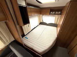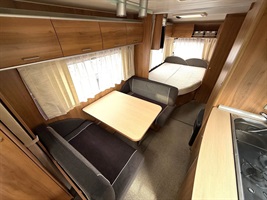 Boční rozkládací sezení, francouzská postel, palandy, garáž pod sklopnou palandou, kuchyň, WC se sprchou,