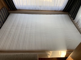 Rozkládací boční sezení, francouzská postel, palandy, kuchyň, WC s umyvadlem a sprchou