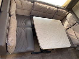 Rozkládací sezení ve tvaru U, velká francouzská postel, palandy, kuchyň, WC s umyvadlem, plnohodnotná sprcha