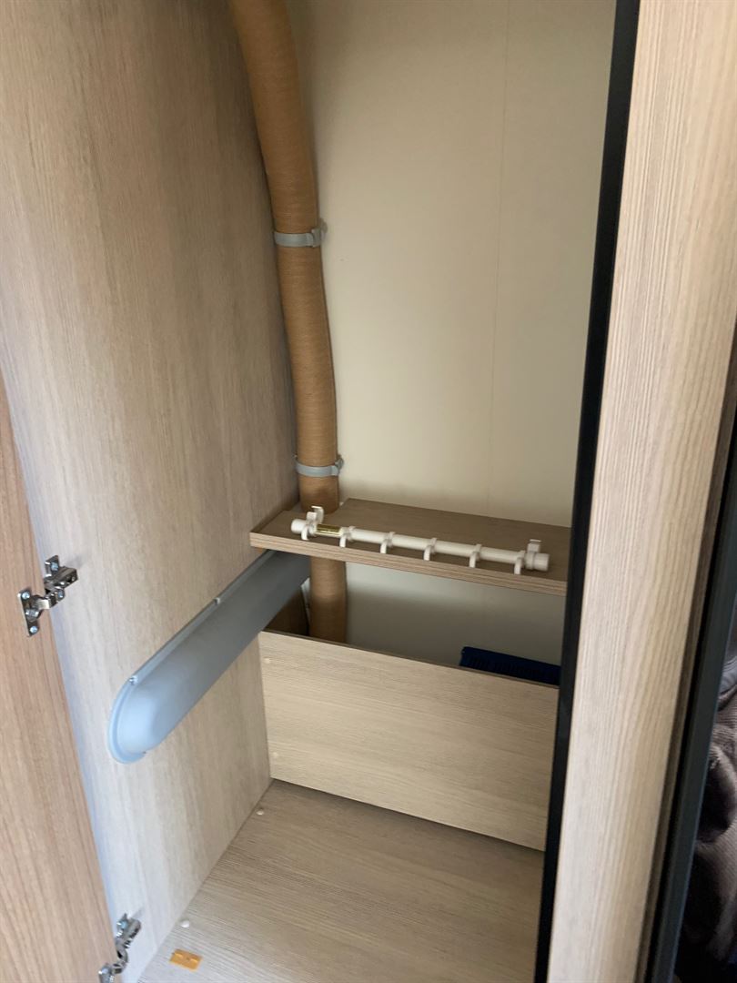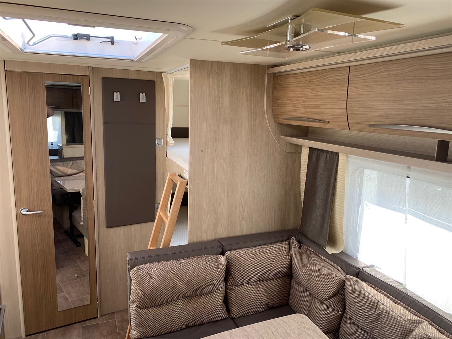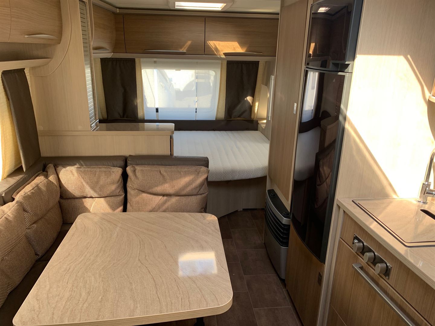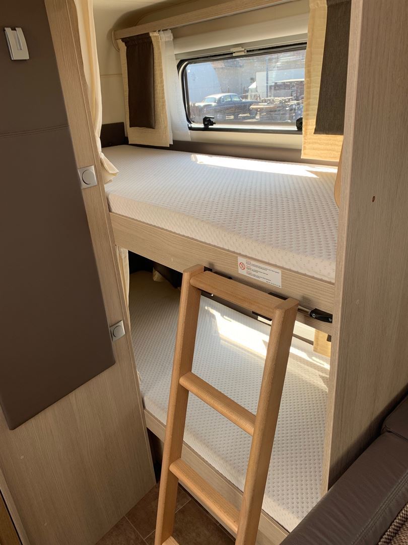 Rozkládací sezení ve tvaru U, velká francouzská postel, palandy, kuchyň, WC s umyvadlem, plnohodnotná sprcha