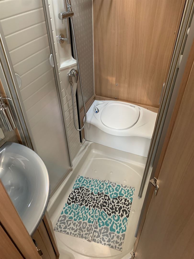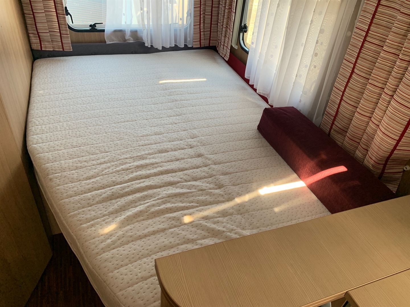 Velké rozkládací sezení ve tvaru U, francouzská postel, kuchyň, WC, plnohodnotná sprcha, umyvadlo