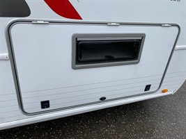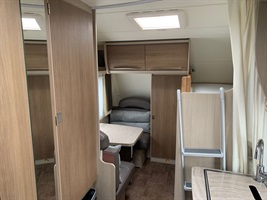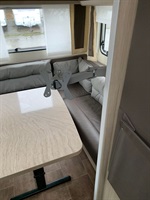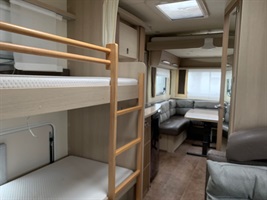 Rozkládací sezení do tvaru U + možnost rozšíření stolu na extra veliký až k oknu, , spouštěcí postel nad sedačkou, kuchyň, WC s umyvadlem a střešním oknem, palandy + rozkládací boční sezení