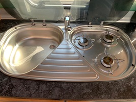 Velké rozkládací sezení ve tvaru U, velká francouzská postel, kuchyň, WC se sprchou a sprchovou vaničkou, umyvadlo zvlášť