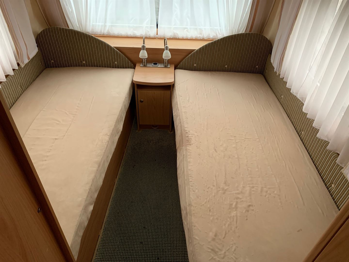 Rozkládací sezení ve tvaru U, dvě oddělené postele (možnost dokoupení roštu pro vytvoření velkého lůžka), kuchyň, WC s umyvadlem a sprchovou vaničkou