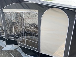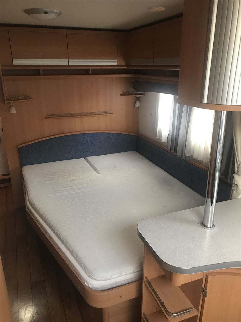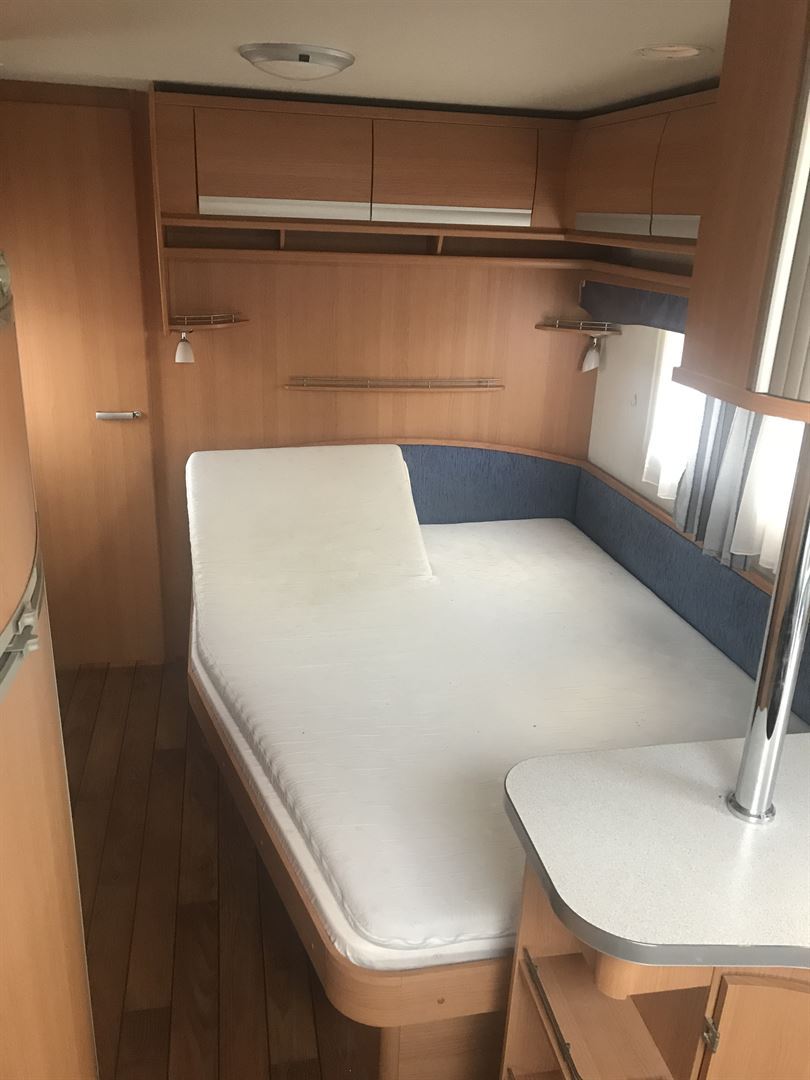 Velké rozkládací sezení ve tvaru U, velká francouzská postel, kuchyň, WC, samostatná sprcha
