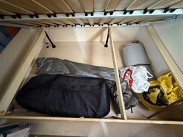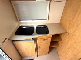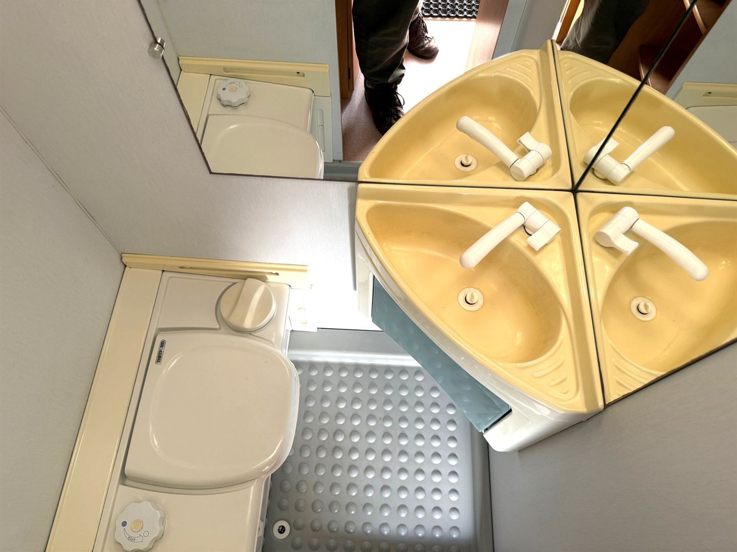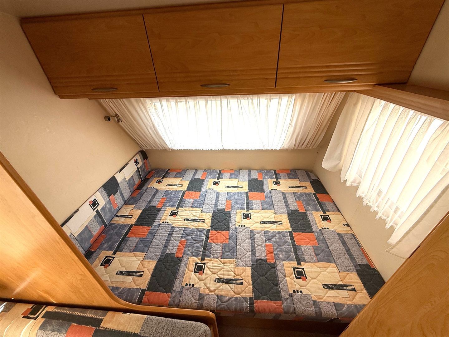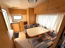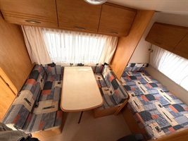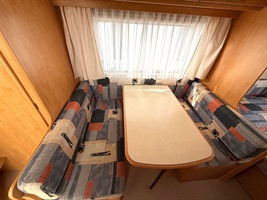 Rozkládací boční sezení, francouzská postel, kuchyň vzadu, koupelna s umyvadlem a WC