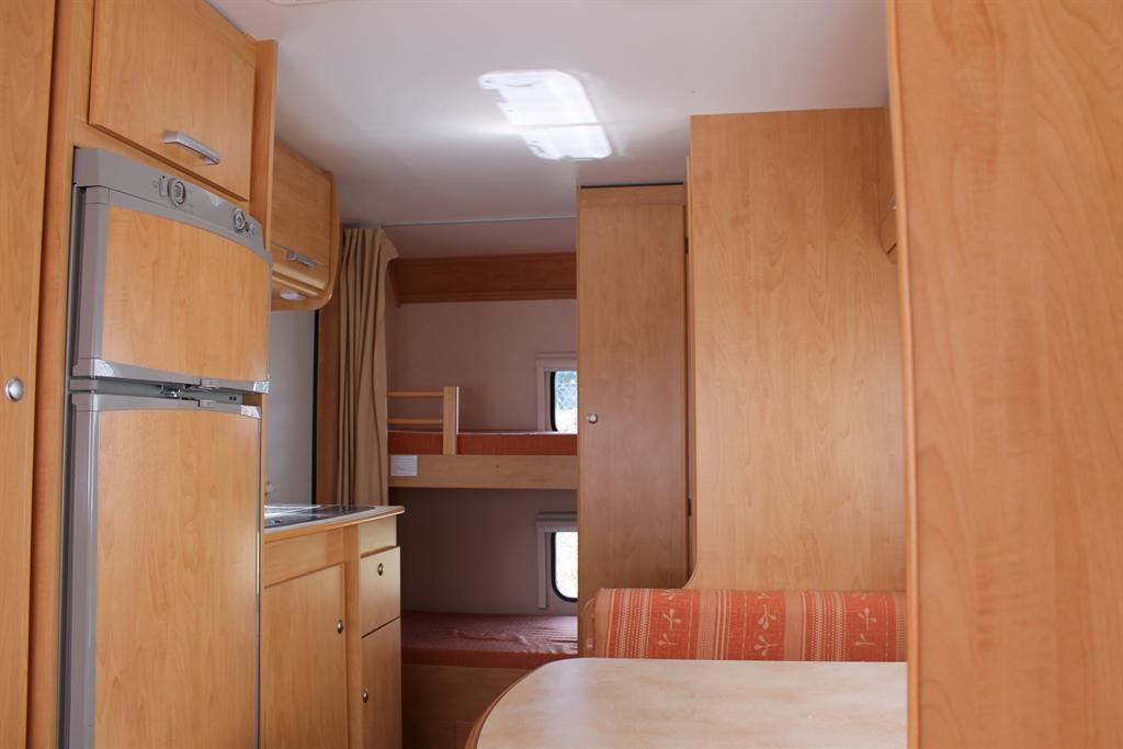 celková hmotnost 1300 Kg,max rychlost 100 km/hod,veklá francouzská postel,rozkládací sezení ,palandy-až pro 6 osob,WC se sprchou,kuchyně s dvoudveřovou lednicí,vařičem a dřezem,bojler,zadní garáž.
