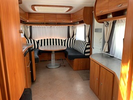 Velké rozkládací sezení ve tvaru U , velká francouzská postel, kuchyň, WC se sprchou, umyvadlo zvlášť