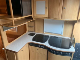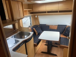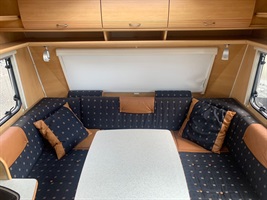 Rozkládací sezení do ,,U", velká francouzská postel, kuchyň, WC se sprchou , toaletní koutek