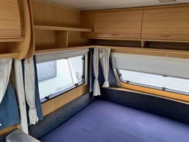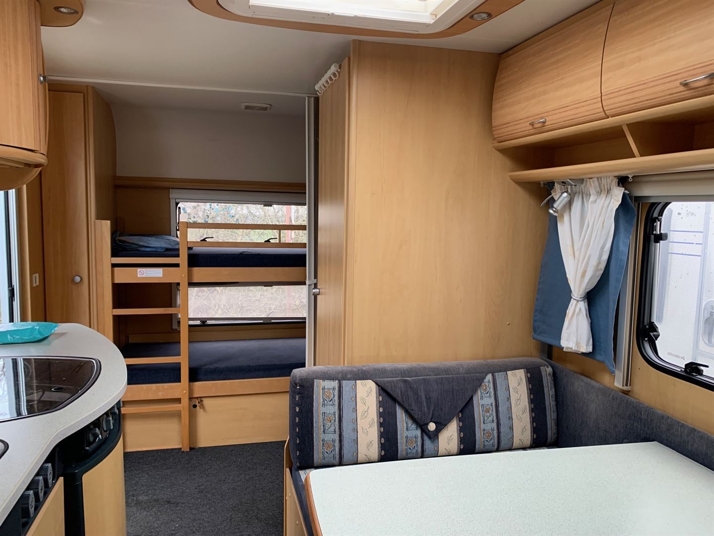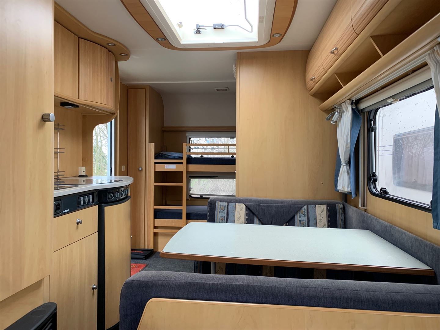 Boční rozkládací sezení 190 x 103 cm, velká francouzská poste 210 x 140 cm, palandy 193 x 75 cm, kuchyň, WC se střešním oknem s umyvadlem se sprchou a kolejnicí pro sprchový závěs
