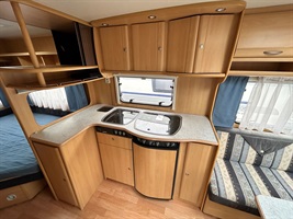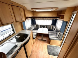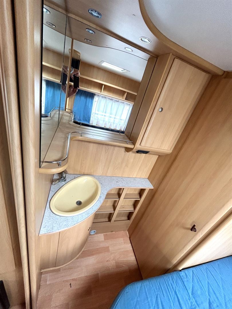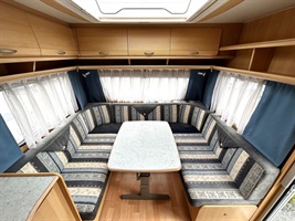 Velké rozkládací sezení ve tvaru U, francouzská postel, kuchyň, WC se sprchou včetně kolejnice na sprchový závěs ( potřeba dokoupit baterii), toaletní koutek