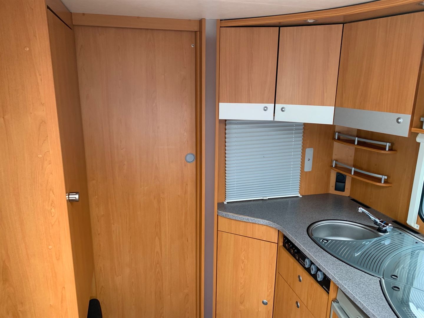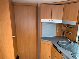Rozkládací sezení ve tvaru U, francouzská postel, kuchyň, WC se sprchou, toaletní koutek