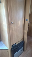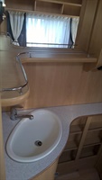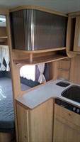 Rozkládací sezení do ,,U", velká francouzská postel, kuchyň, WC se sprchou a sprchovou vaničkou, umyvadlo zvlášť.