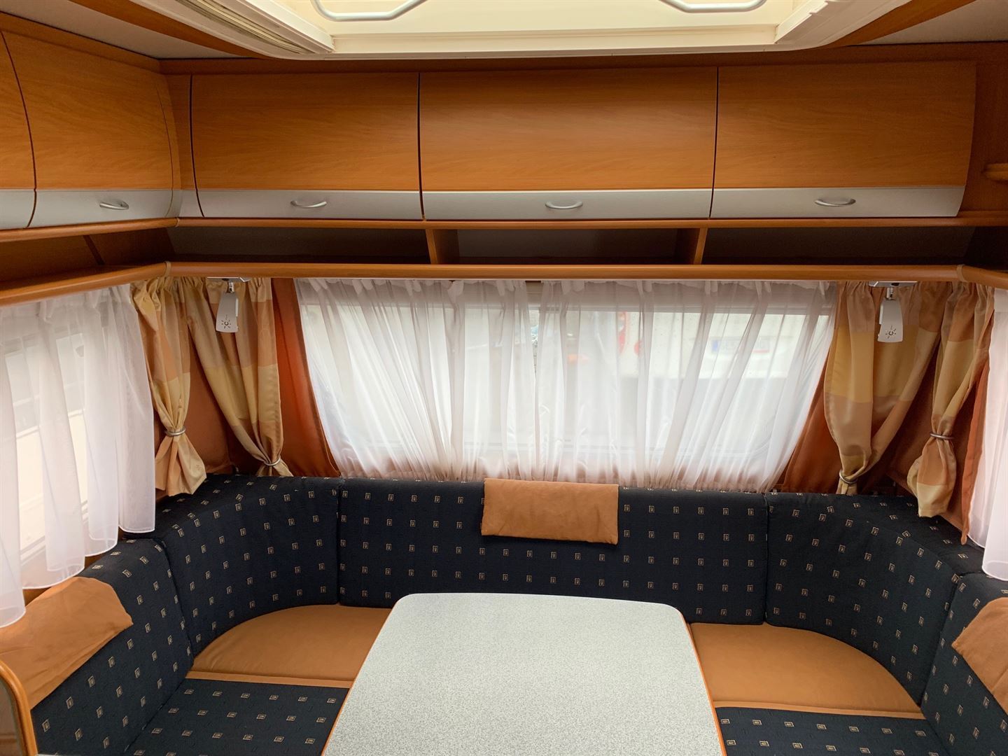 Velké rozkládací sezení do tvaru U, velká francouzská postel, kuchyň, WC se sprchou a sprchovou vaničkou, umyvadlo zvlášť