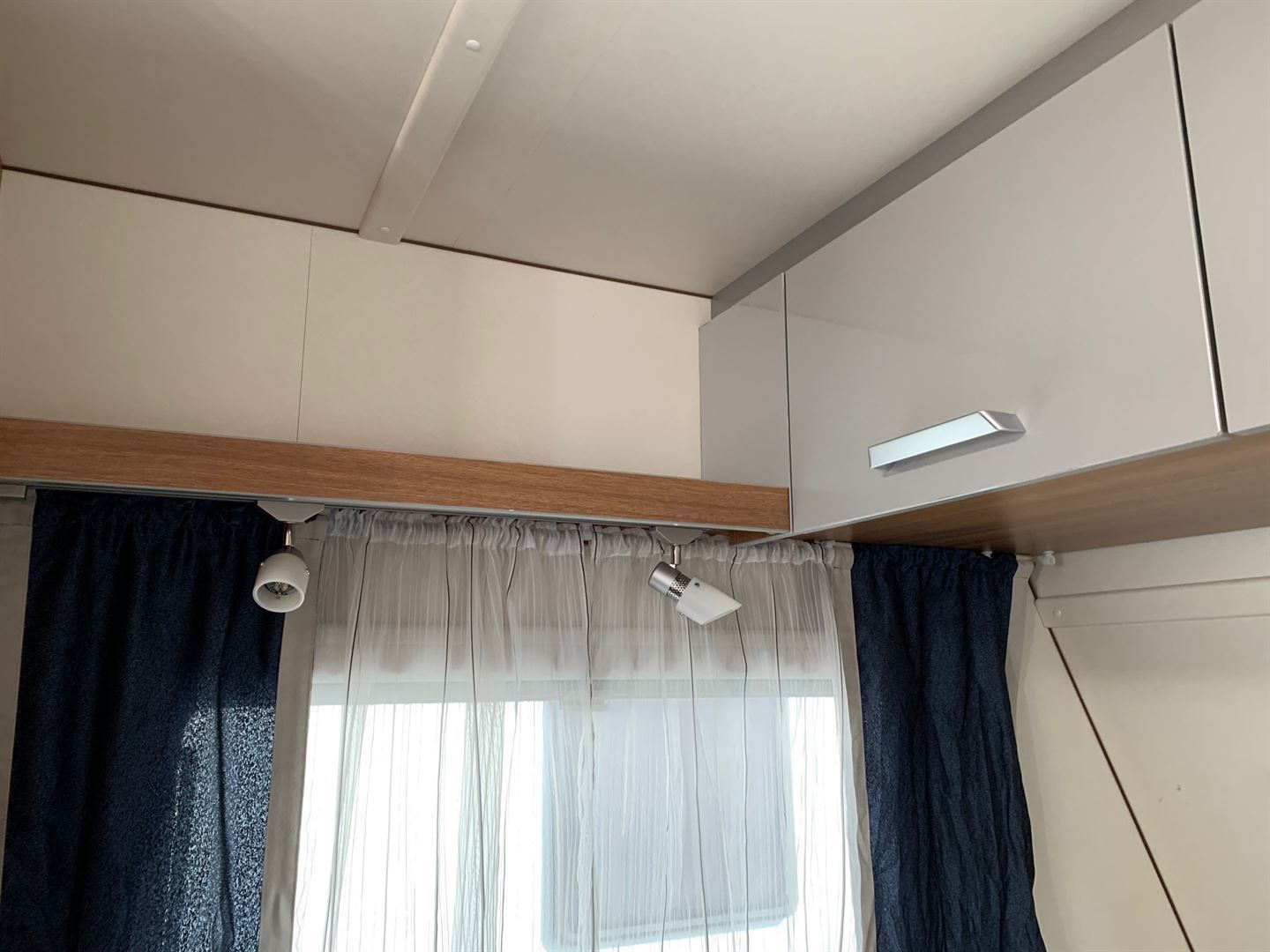 Boční rozkládací sezení, francouzská postel, kuchyň, WC se sprchou, sprchovou vaničkou a umyvadlem