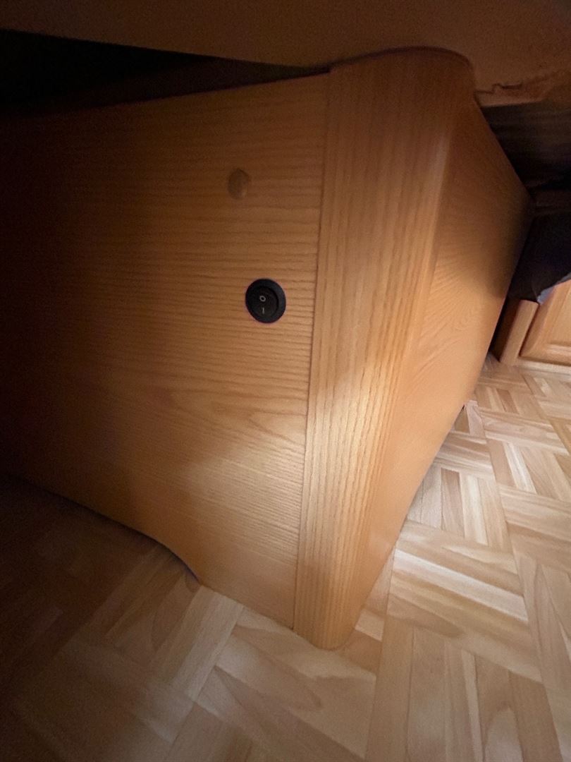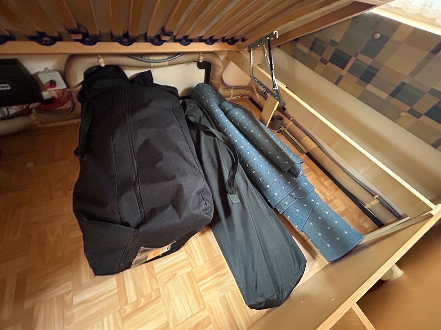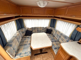 Velké rozkládací sezení ve tvaru U, francouzská postel, kuchyň, WC se sprchou, toaletní koutek