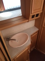 Velké rozkládací sezení do ,,U", velká francouzská postel, kuchyň, WC se sprchou, umyvadlo zvlášť.