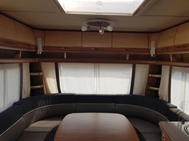 Velké rozkládací sezení ve tvaru U, francouzská postel, kuchyň, WC se sprchou, toaletní koutek
