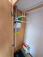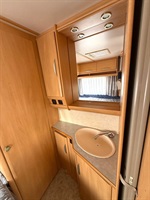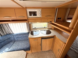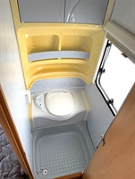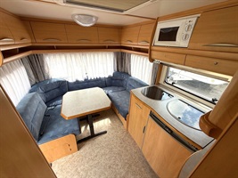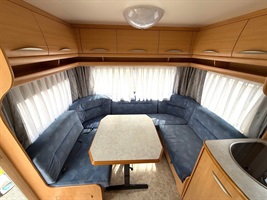 Velké rozkládací sezení ve tvaru U, francouzská postel, kuchyň, WC se sprchovou vaničkou, umyvadlo zvlášť.