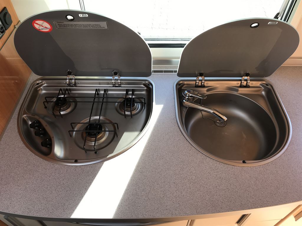 Rozkládací boční sezení, velká francouzská postel, palandy, kuchyň, WC s umyvadlem a sprchovou vaničkou