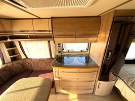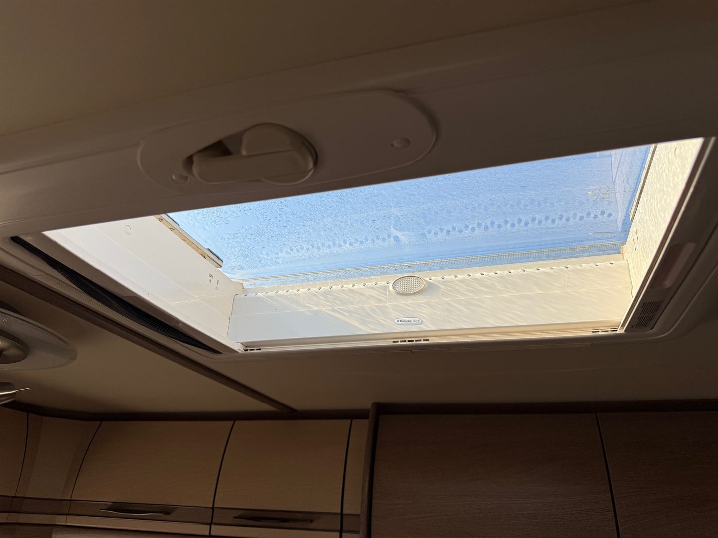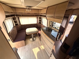 Velké rozkládací sezení ve tvaru U, francouzská postel, kuchyň, WC se SPRCHOU, toaletní koutek