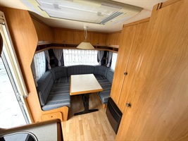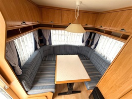 Velké rozkládací sezení do ,,U", manželská postel, kuchyň, WC s umyvadlem sprchovou vaničkou