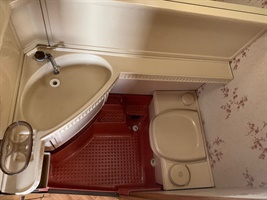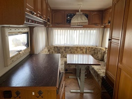Velké rozkládací sezení ve tvaru U, boční rozkládací sezení oddělené zástěnou, kuchyň, WC s umyvadlem