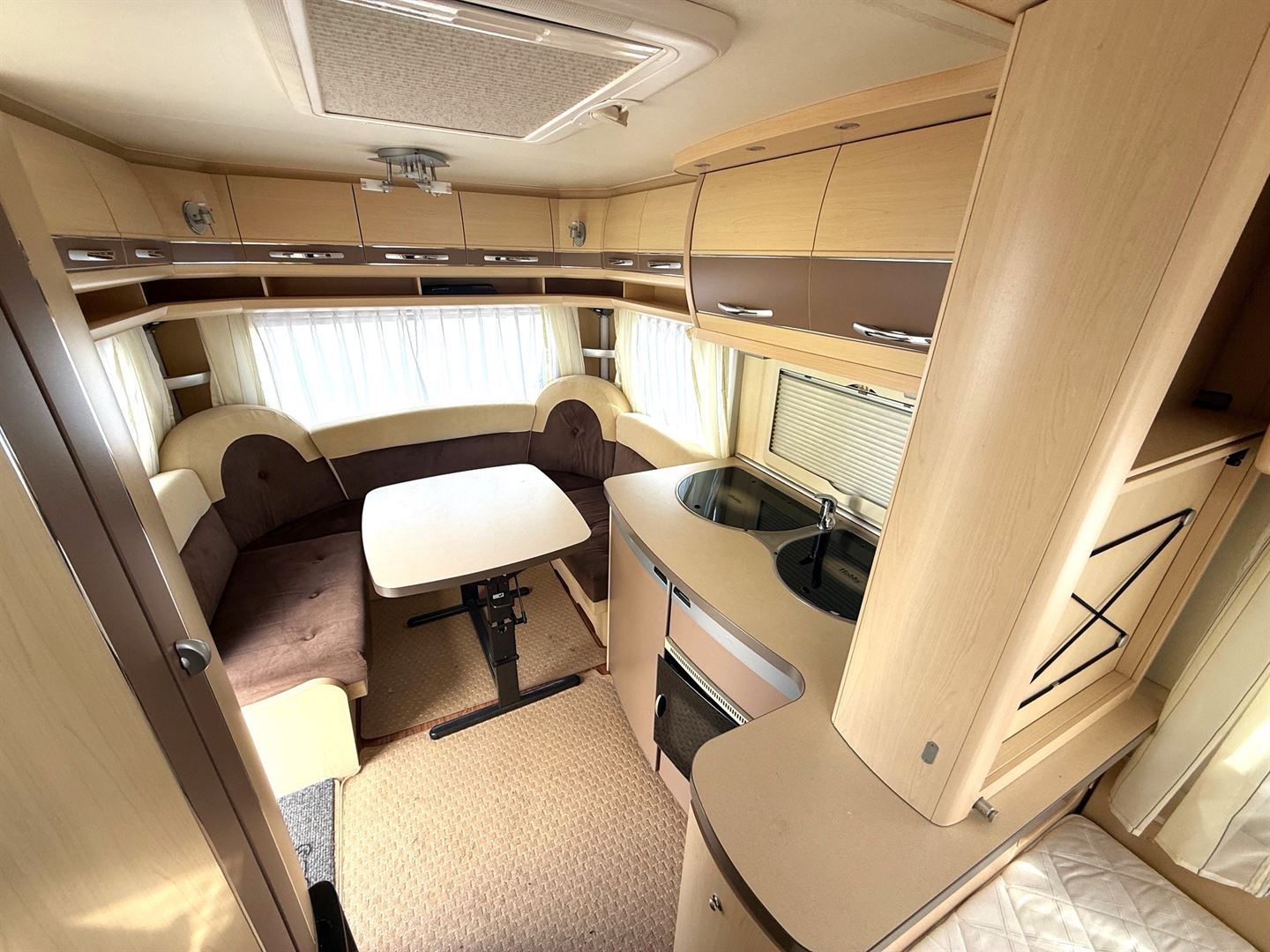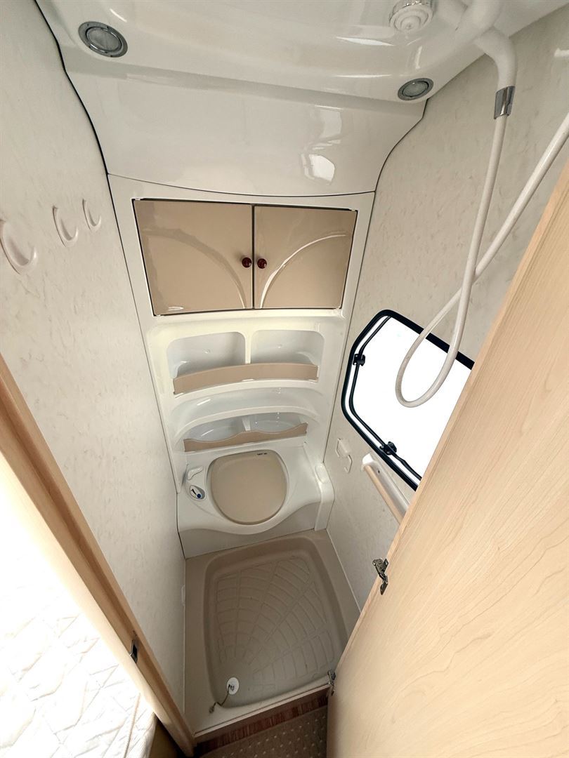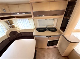 Velké rozkládací sezení ve tvaru U, francouzská postel, kuchyň, WC se sprchou, toaletní koutek
