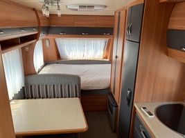 Rozkládací boční sezení, velká francouzská postel, palandy, kuchyň, WC s umyvadlem.