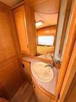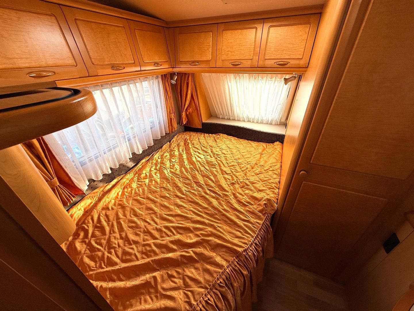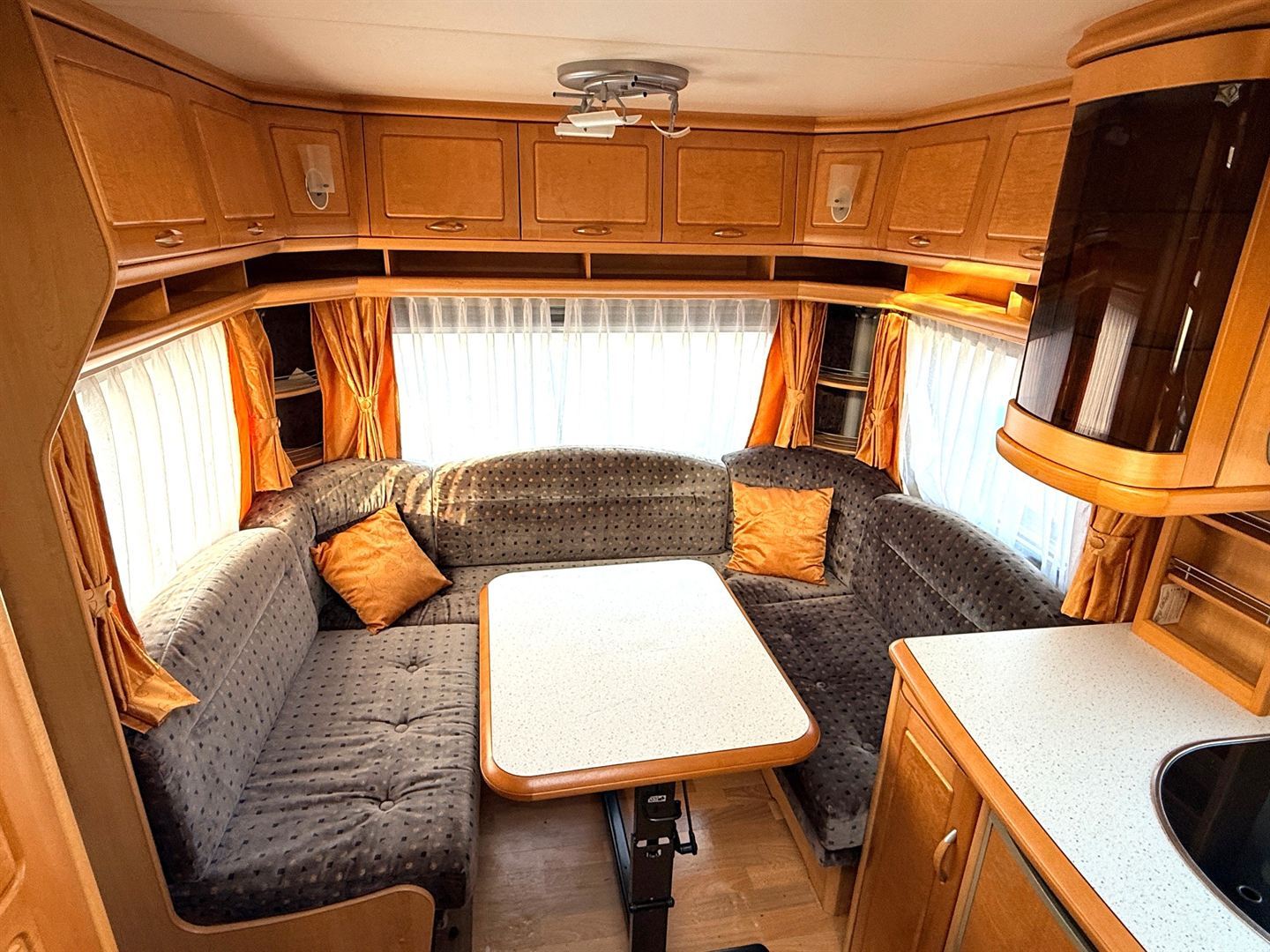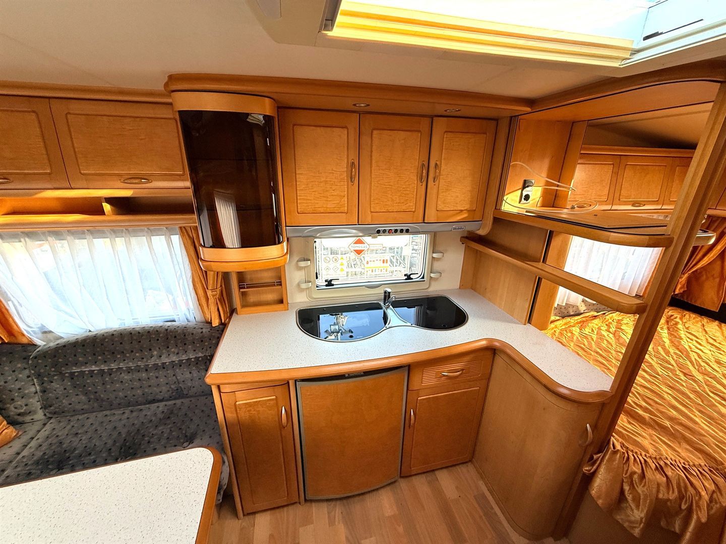Velké rozkládací sezení ve tvaru U, velká francouzská postel, kuchyň, WC se sprchou, toaletní koutek